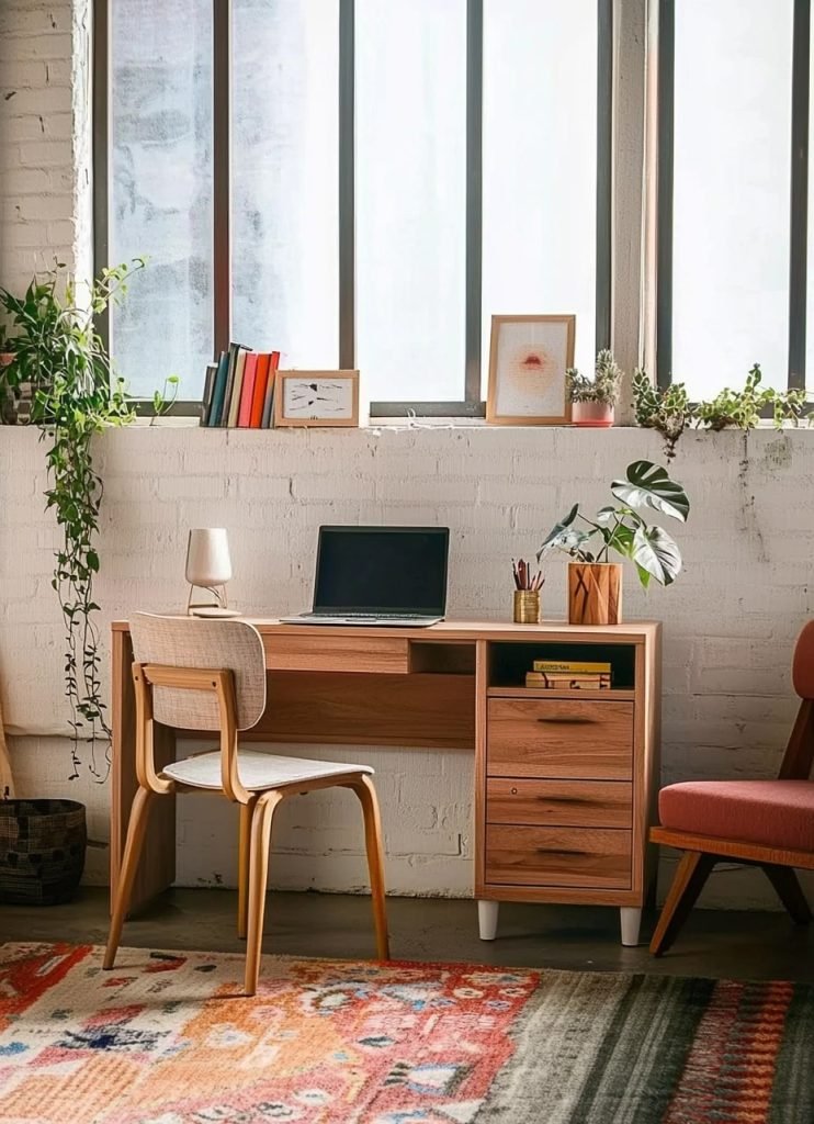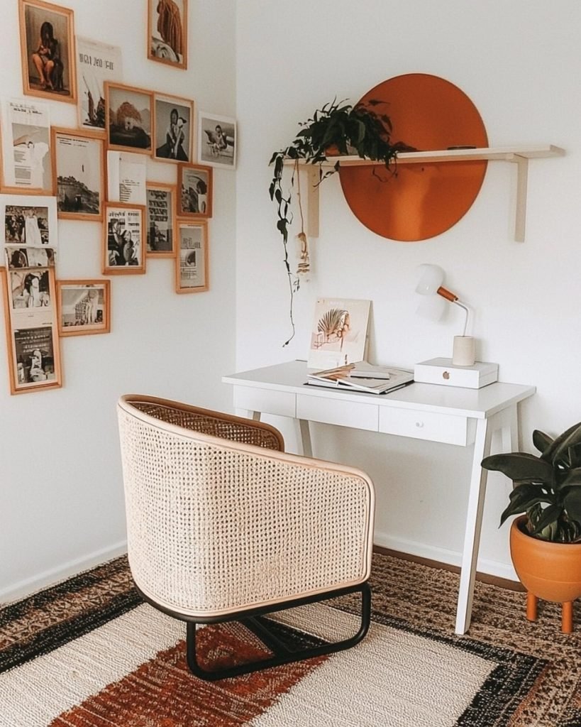 A gallery wall of framed photos adds personality, while plants in terracotta pots bring warmth. The patterned rug and natural elements create an eclectic, cozy corner for work.