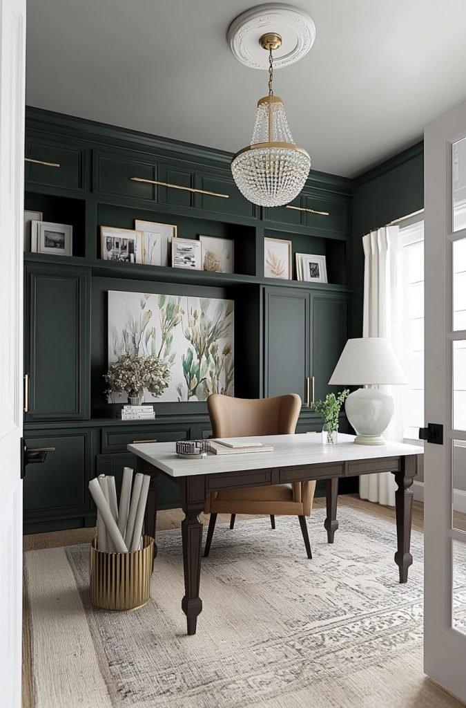 Dark green cabinetry and a large white desk define this elegant office. A tan chair sits beneath a gold chandelier, adding a touch of luxury.