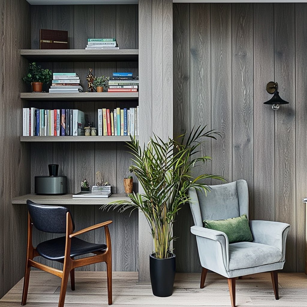 This office features gray wooden paneling and floating shelves filled with books and plants.