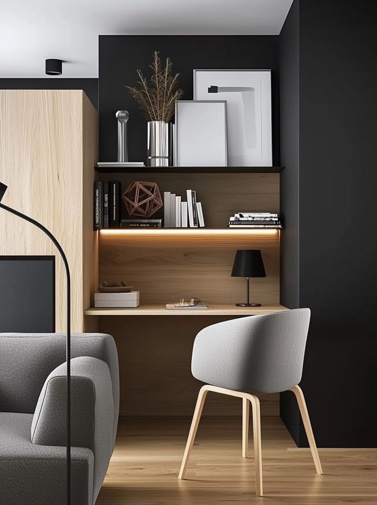 This sleek office features a black accent wall paired with a wooden desk and shelves.