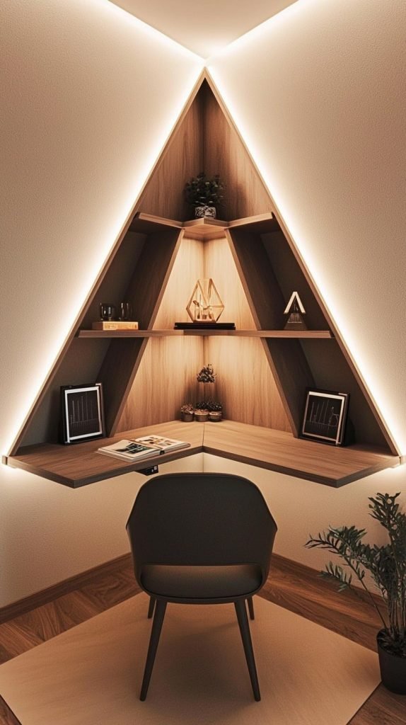 This modern office features a triangular wooden desk with built-in shelves, illuminated by warm LED lighting.