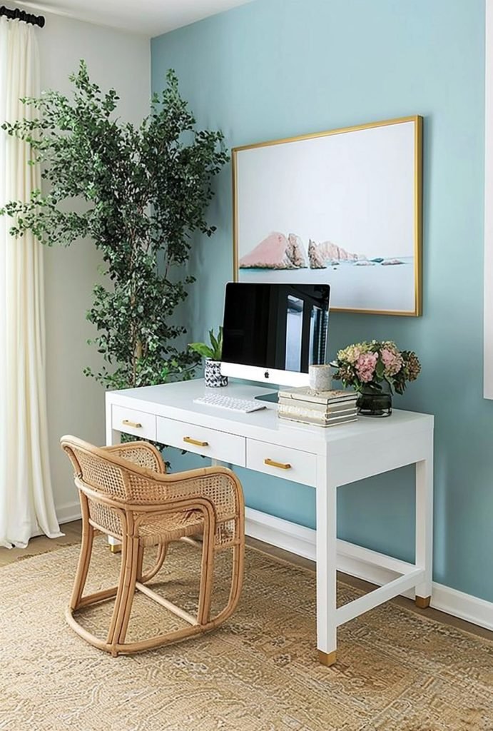 A white desk with gold handles sits against a soft teal wall, paired with a woven chair.