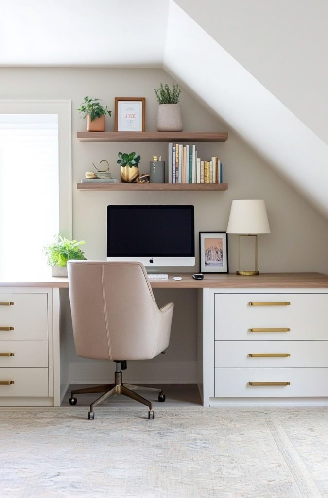 An attic office with a sloped ceiling offers a peaceful escape. The light wood desk pairs with a beige chair, while floating shelves above display books and greenery.