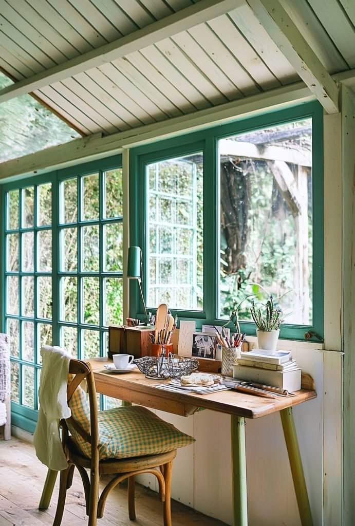 Set in a sunroom with green-framed windows, this office exudes cottage charm. A wooden desk sits against the glass, surrounded by plants and vintage decor.