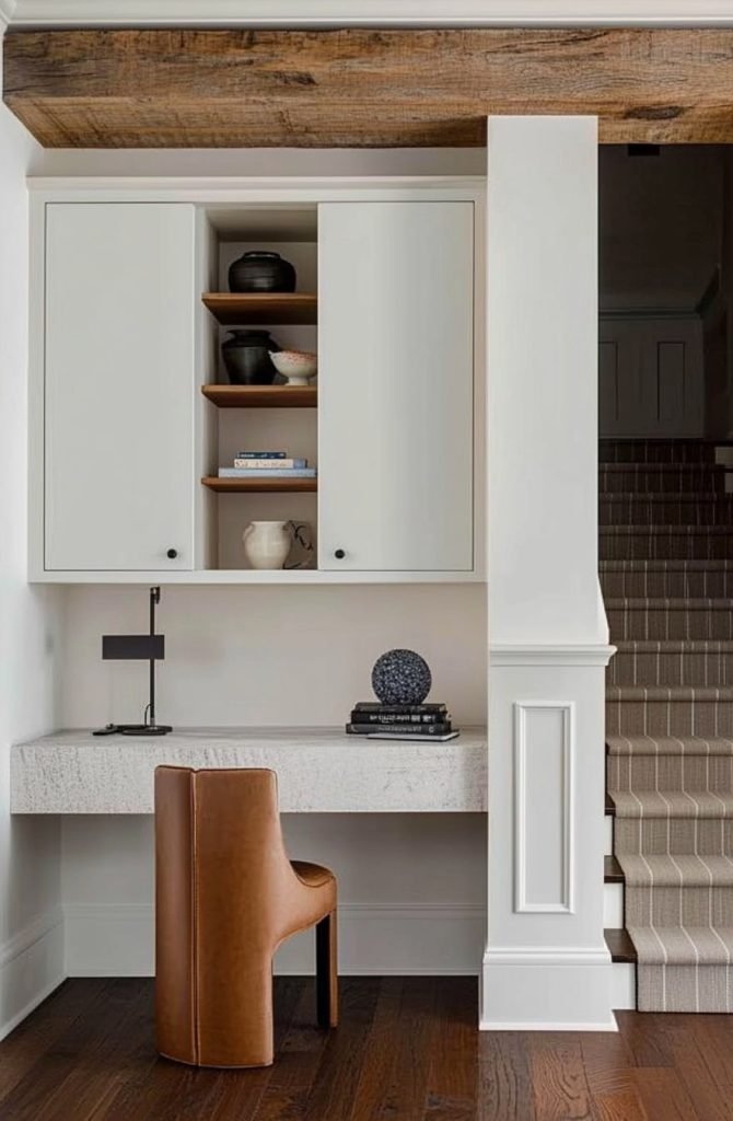 White cabinetry contrasts the warm wooden beam overhead, while open shelves display curated decor. A modern tan chair adds comfort to this charming, compact workspace.