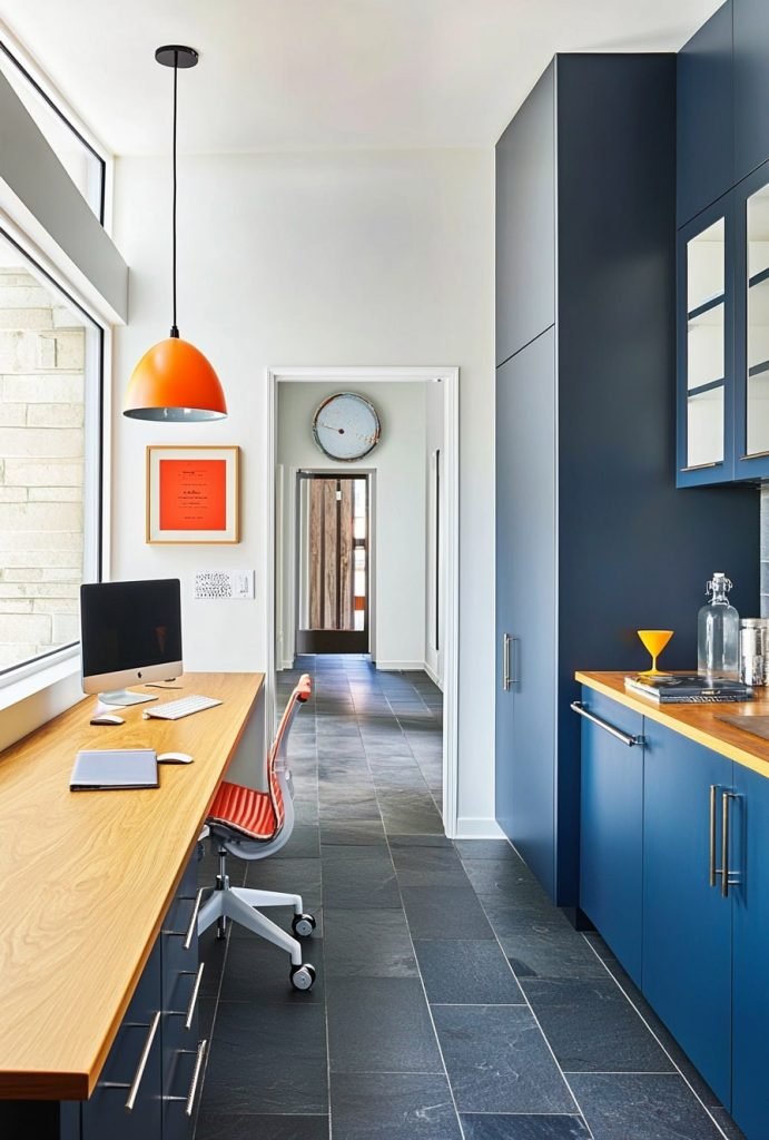 This narrow hallway transforms into a functional office with a long wooden desk. Blue cabinets provide storage, while an orange pendant light adds a bold accent.