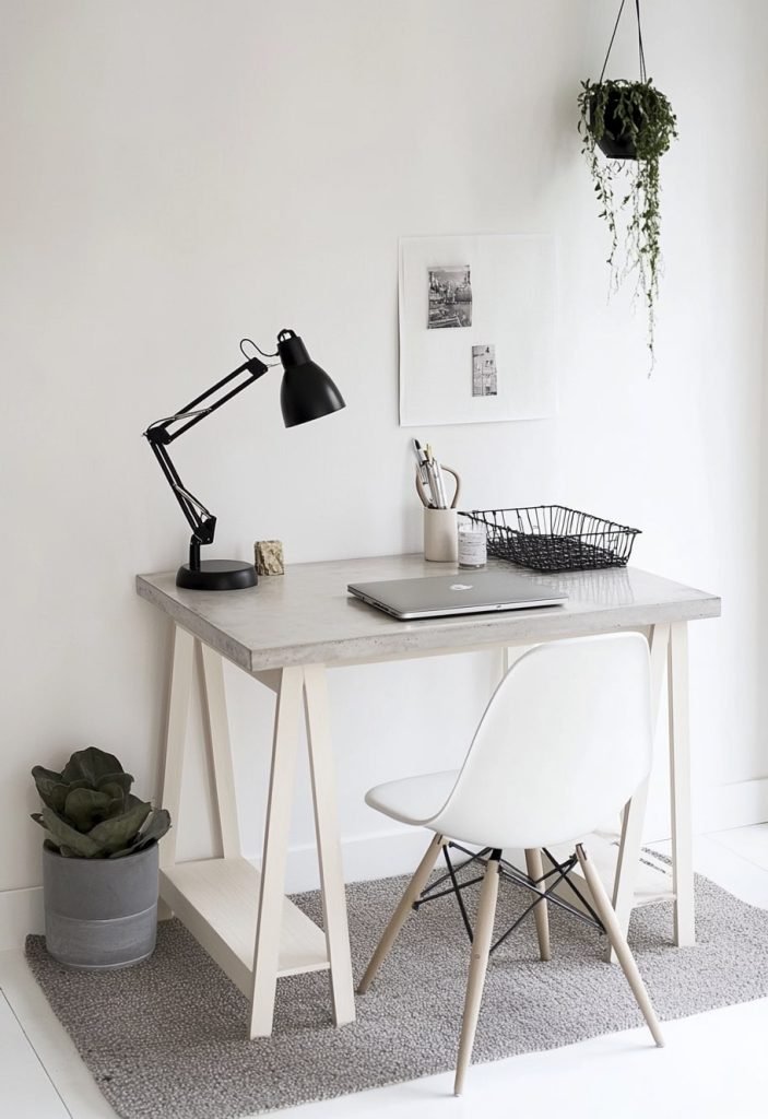The black chair adds contrast, while a cactus and greenery bring a natural touch to this bright, organized setup.